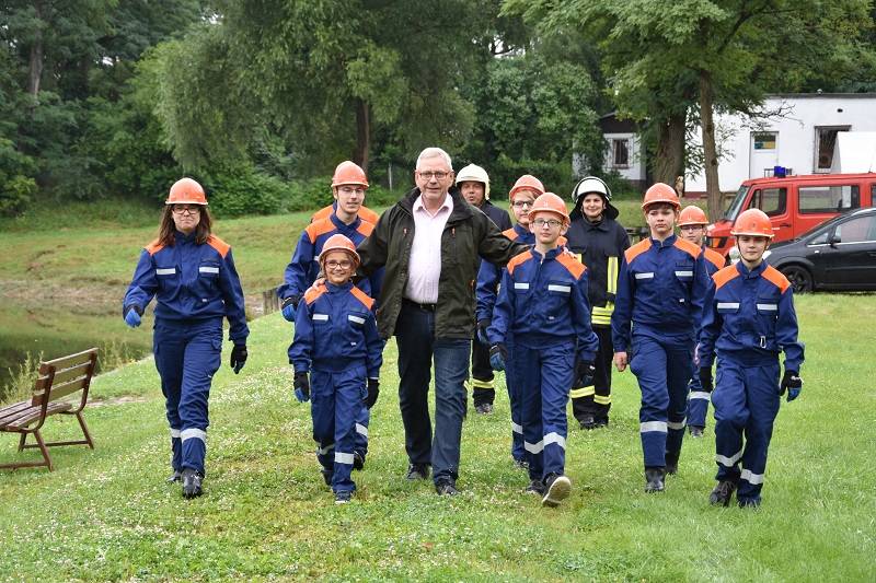 Wie gut die neue Ausrüstung den Nachwuchskameradinnen und -kameraden zu Gesicht stand, davon machte sich auch Köthens Oberbürgermeister Bernd Hauschild bei einem Besucht am 25. Juli 2017 ein Bild. Zudem brachte er ein paar Leckereien für das Abschlussfest des Sommerlagers mit.