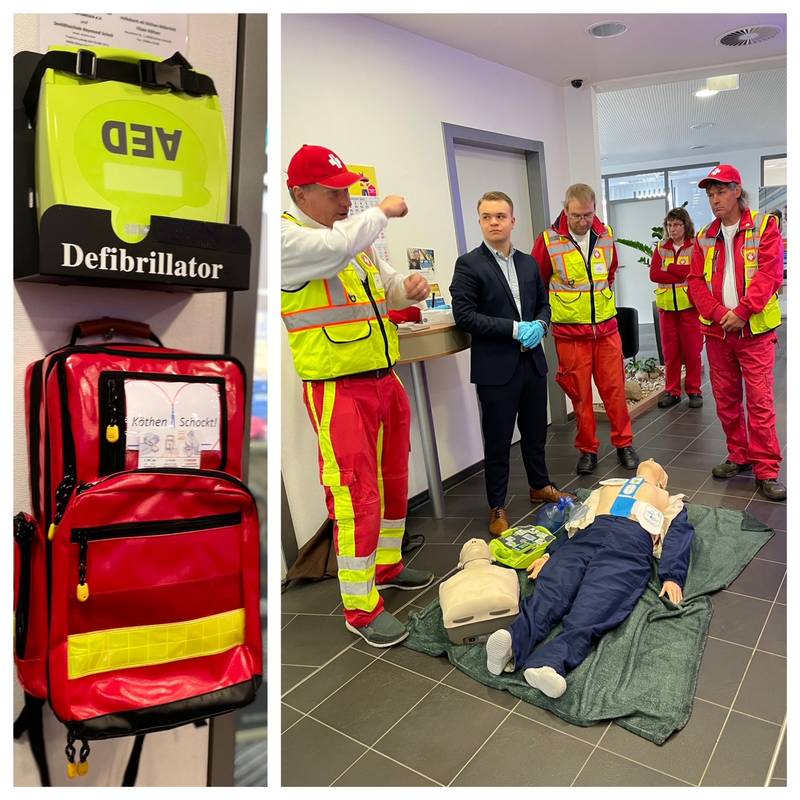 „Köthen Schockt“ – Raymond Schulz trainiert Volksbank-Mitarbeitende am Automatischen Externen Defibrillator