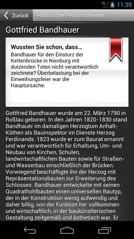 So bietet die App einen virtuellen Stadtrundgang an, der viel Wissenswertes über verschiedene Sehenswürdigkeiten enthält. Neben Informationen zur Stadtgeschichte ist dort auch reichlich Interessantes zu erfahren über historisch bedeutsame Persönlichkeiten, die einst in Köthen lebten und wirkten, darunter der Komponist Johann Sebastian Bach oder der Begründer der modernen Homöopathie, Samuel Hahnemann.