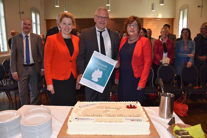 In Köthen (Anhalt) konnte am 16. April 2019 die mittlerweile bundesweit 300. Partnerschaft für Demokratie begründet werden. In einer Feierstunde, zu der die Bundesministerin für Familie, Senioren, Frauen und Jugend, Franziska Giffey, die Landesministerin für Arbeit, Soziales und Integration, Petra Grimm-Benne, sowie die Integrationsbeauftragte des Landes Sachsen-Anhalt Susi Möbbeck in Köthen zu Gast waren, erhielt Oberbürgermeister Bernd Hauschild die Urkunde anlässlich des Jubiläums. Anschließend wurde eine speziell von der Köthener Konditorei Rödel gebackene und entsprechend verzierte Torte angeschnitten.
